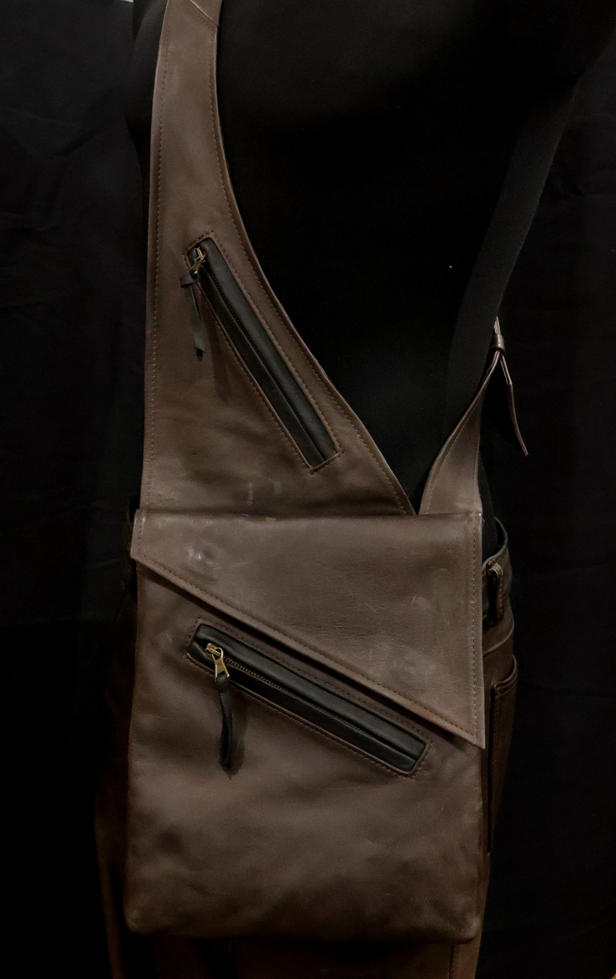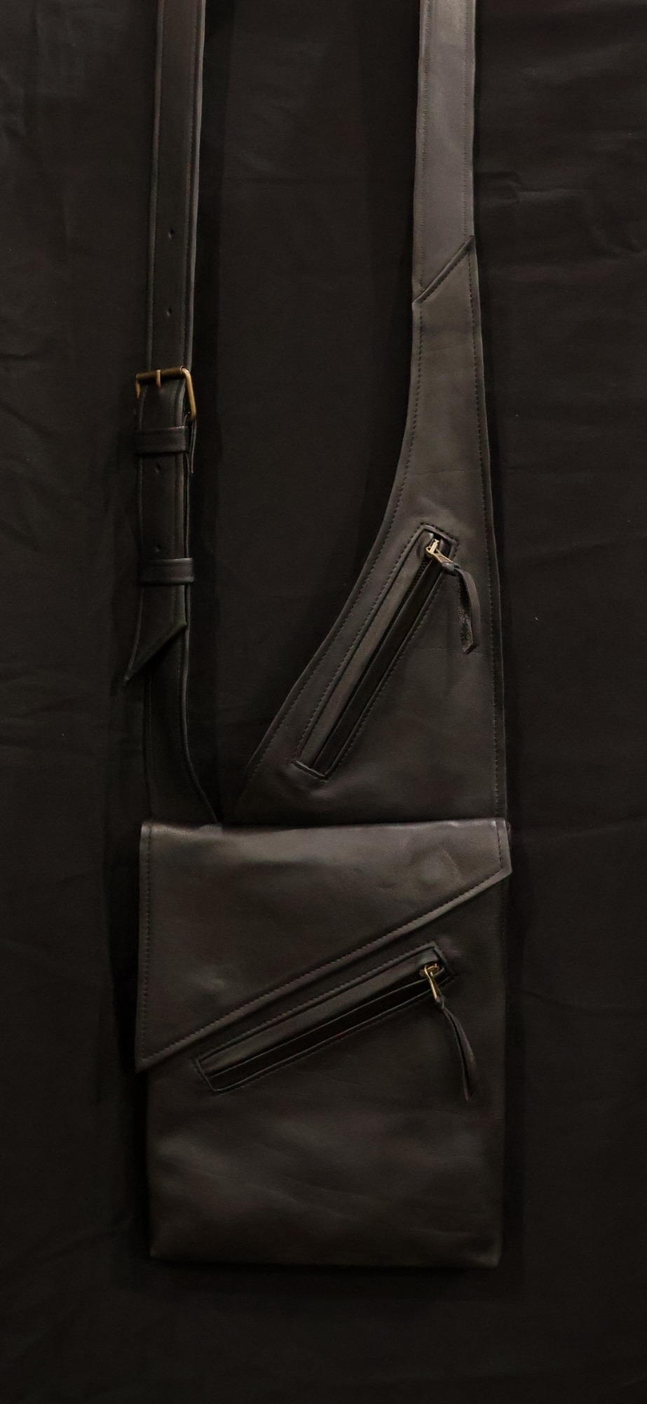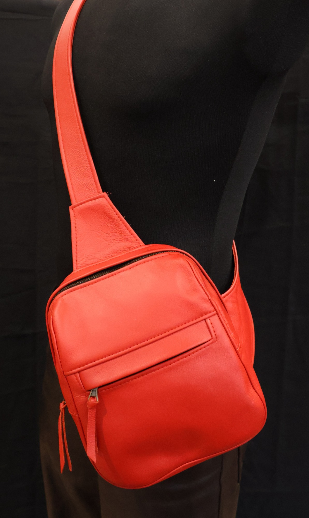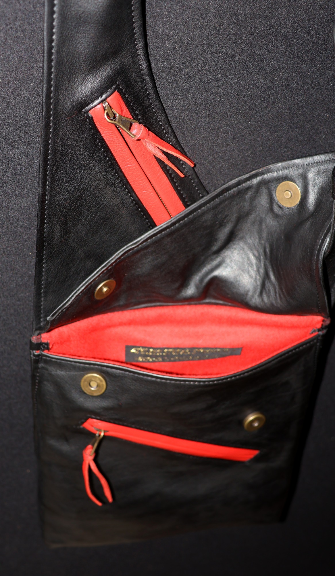 Gefertigt aus Rindnappa- oder Rindnubukleder mit Merinowollfutter. Für Linksträger (siehe rotes Modell) oder spiegelverkehrt für Rechtsträger (siehe schwarzes und braunes Modell). Die Tasche hat Außentaschen mit Reißverschluss (eines davon diebstahlsicher auf der Innenseite am Körper für den Geldbeutel) und ein großes und ein kleines Innenfach. Sie hat durch ihren kompakten Aufbau viel Volumen. Preis: 230 €