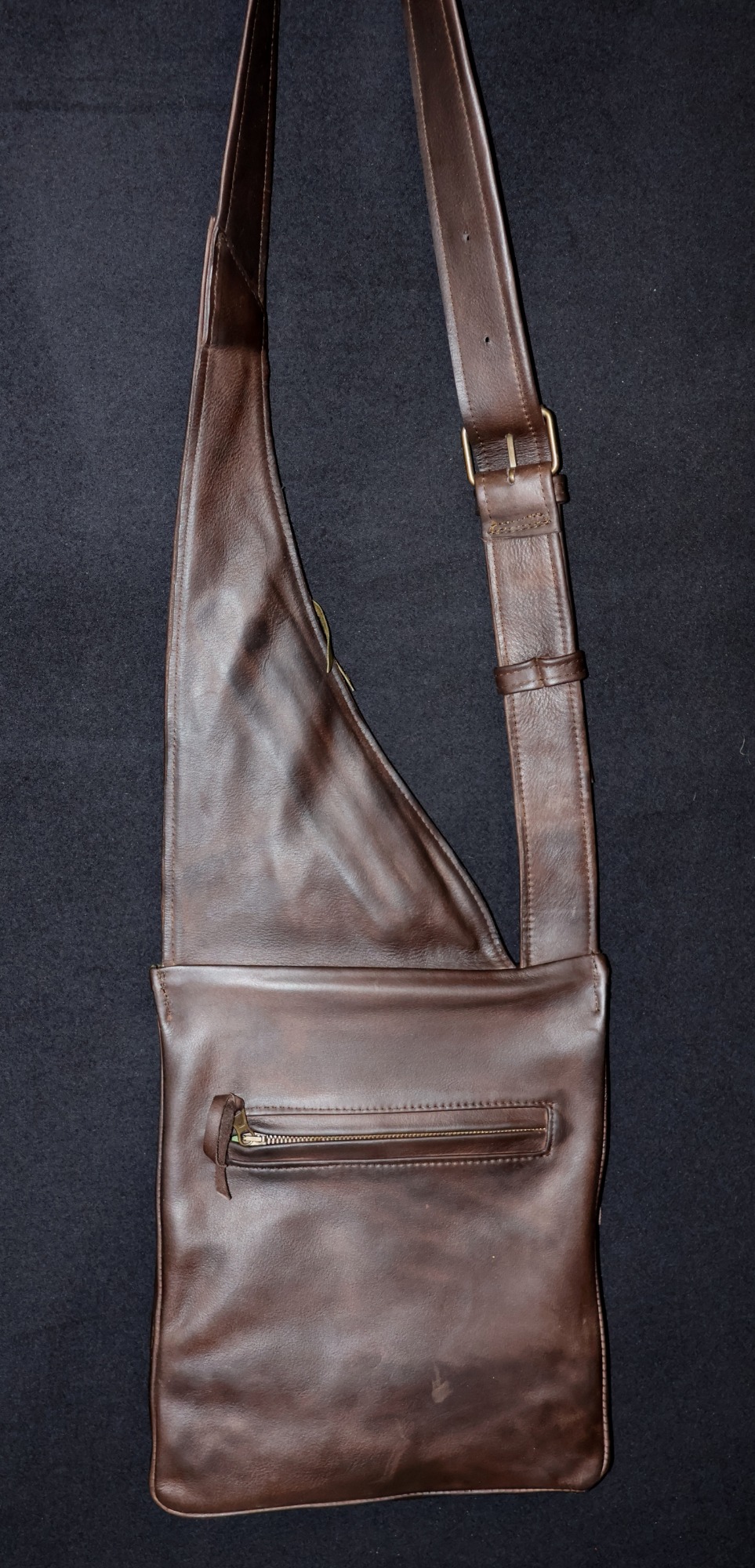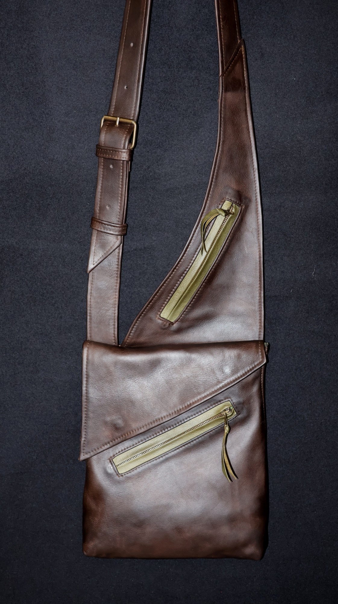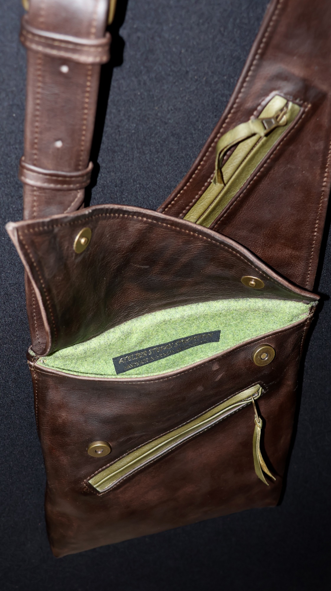 Gefertigt aus Rindnappa- oder Rindnubukleder mit Merinowollfutter. Für Linksträger (siehe schwarz-rotes Modell) oder spiegelverkehrt für Rechtsträger (siehe braun-grünes und rotes Modell). Die Tasche hat 3 Außentaschen (eines davon diebstahlsicher auf der Innenseite am Körper für den Geldbeutel) und ein großes Innenfach. Sie kann durch ihren flachem Aufbau auch unter einer Jacke getragen werden und hat trotzdem viel Volumen. Preis: 230 €